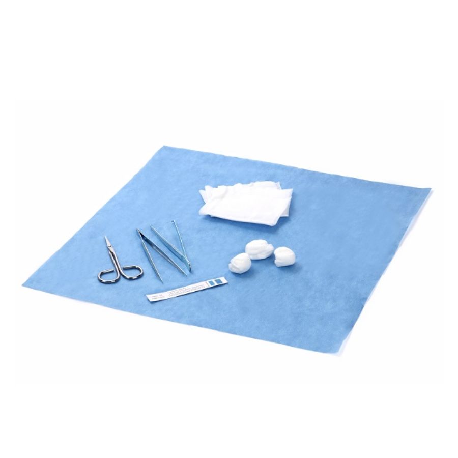Spunlace bolde, 35g/m² spunlace, 3 stk Engangsforbindingspincet, metal, spids spids, 12cm, 1 stk Vævspincet, metal, 12cm, 1 stk Spunlace pads, 14,5 x 19,35 cm, foldet størrelse 7,25 x 9,75 cm, 4-lags, 3 stk. Suturfjernelsessaks, metal, 14cm, 1 stk Bakke, 17 x 11 cm, 1 stk Indpakning, 40 x 40 cm, 35 g/m² SMS nonwoven stof, 1 stk. Steriliseringsindikatorkort, 1 stk |